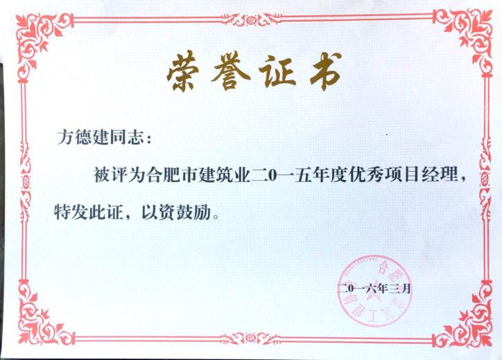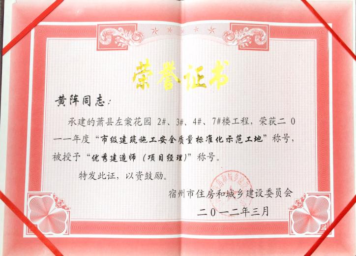 萧县左岸花园4#楼工程被授予优秀建造师(项目经理)--黄阵