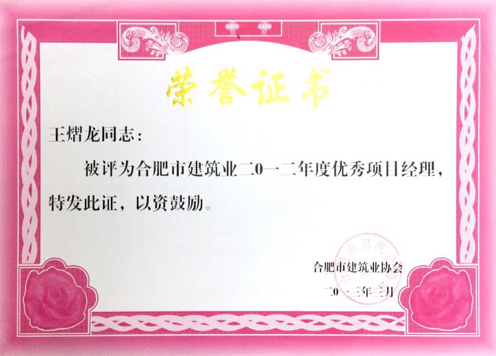 >合肥市建筑业2012年度优秀项目经理——王熠龙
