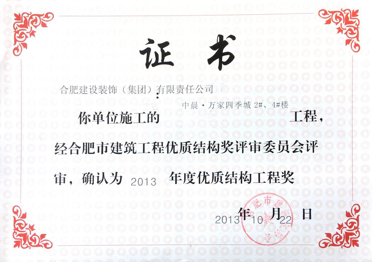 >2013年度优质结构工程奖--中晨万家四季城