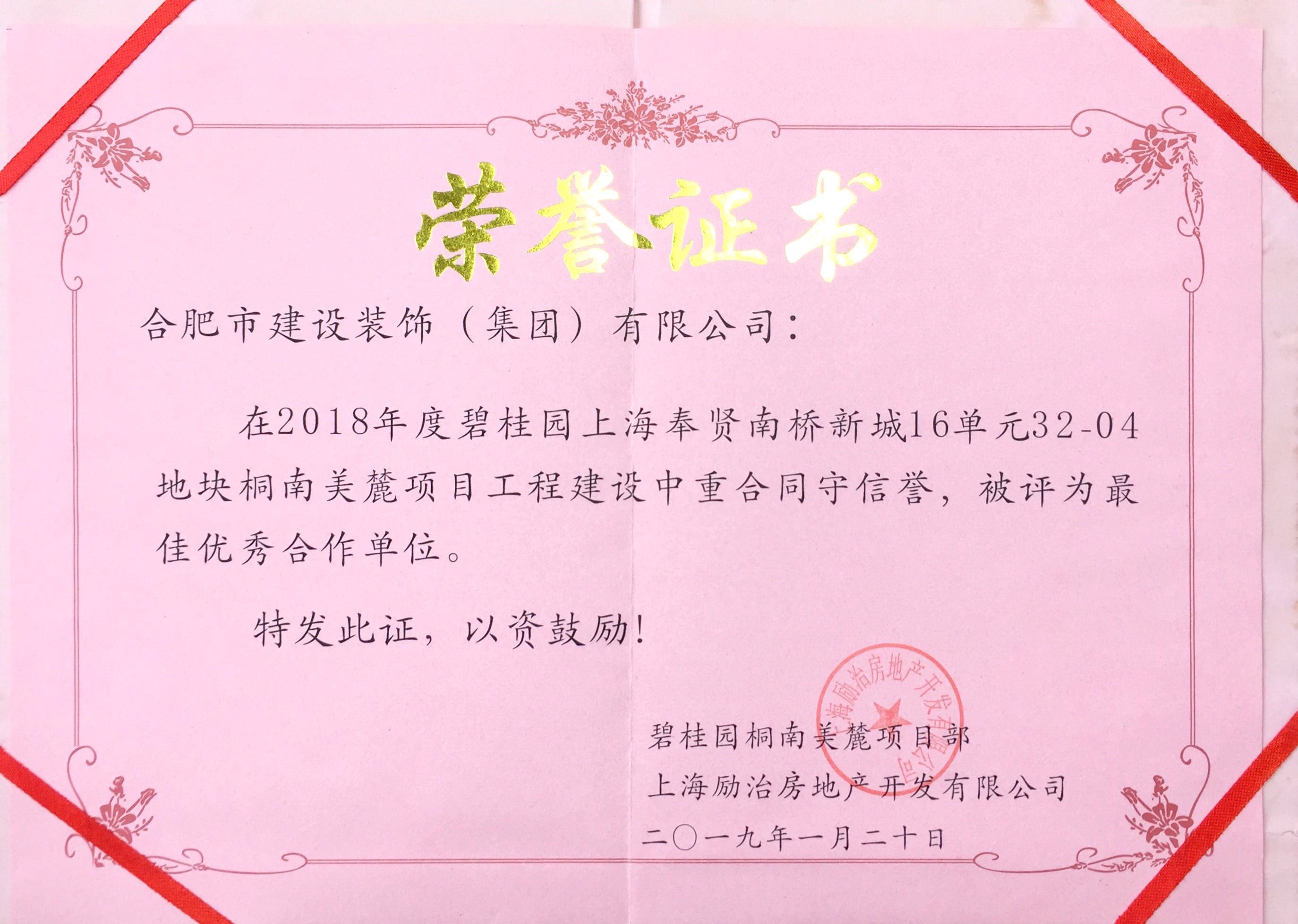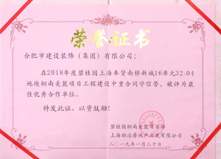 >2018年度碧桂园上海奉贤南桥新城16单元32-04地块桐南美麓项目工程建设者重合同守信誉,被评为最佳优秀合作单位