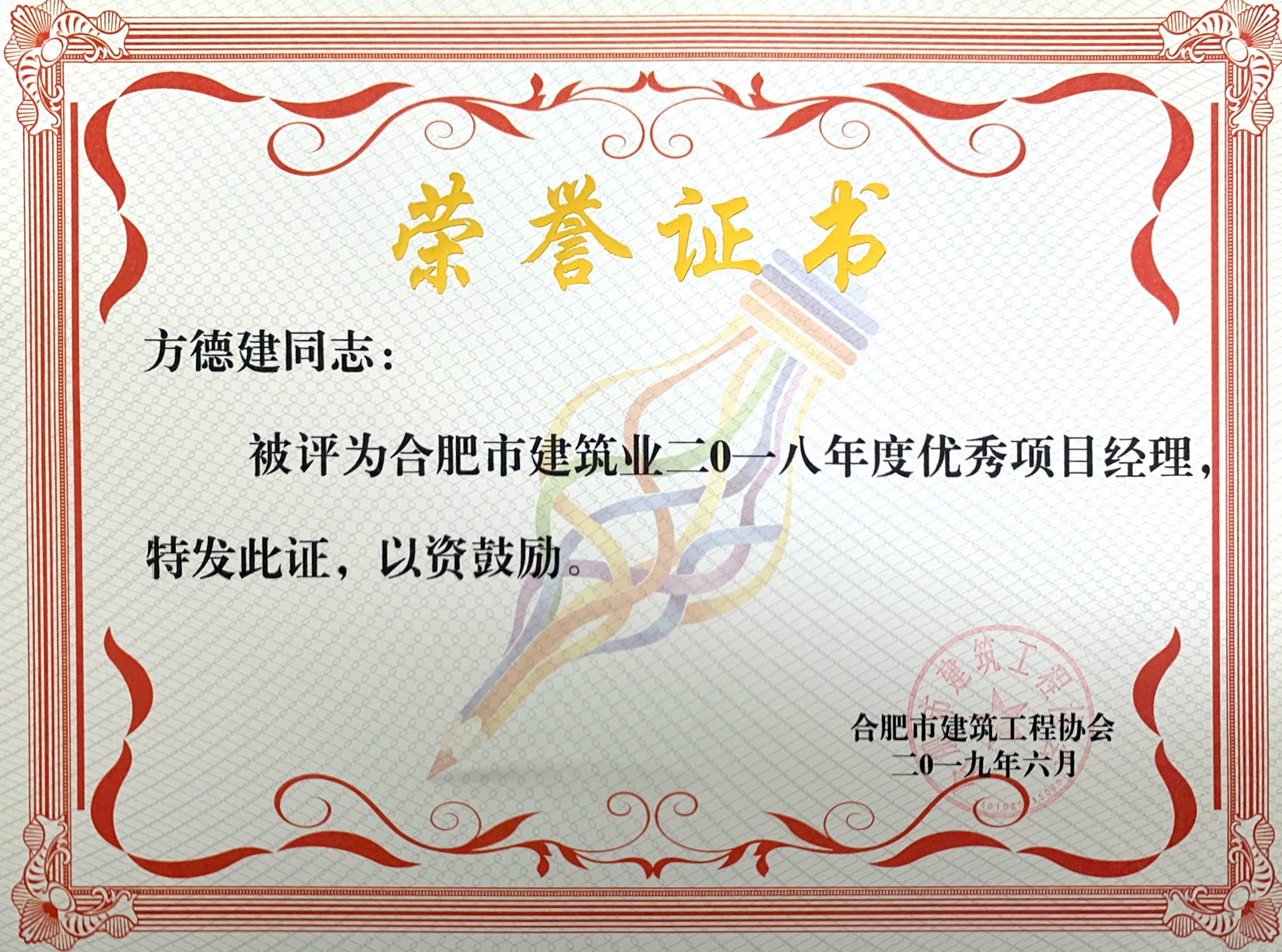 >合肥市建筑业2018年度优秀项目经理——方德建