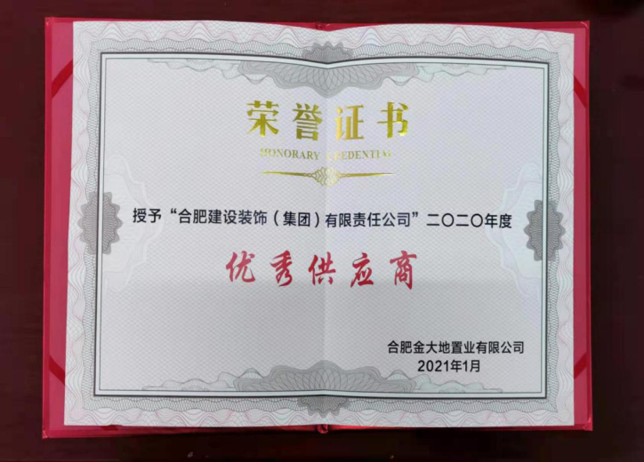 >合肥金大地置业有限公司2020年度“优秀供应商”证书