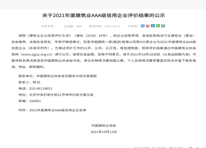 关于2021年度建筑业AAA级信用企业评价结果的公示