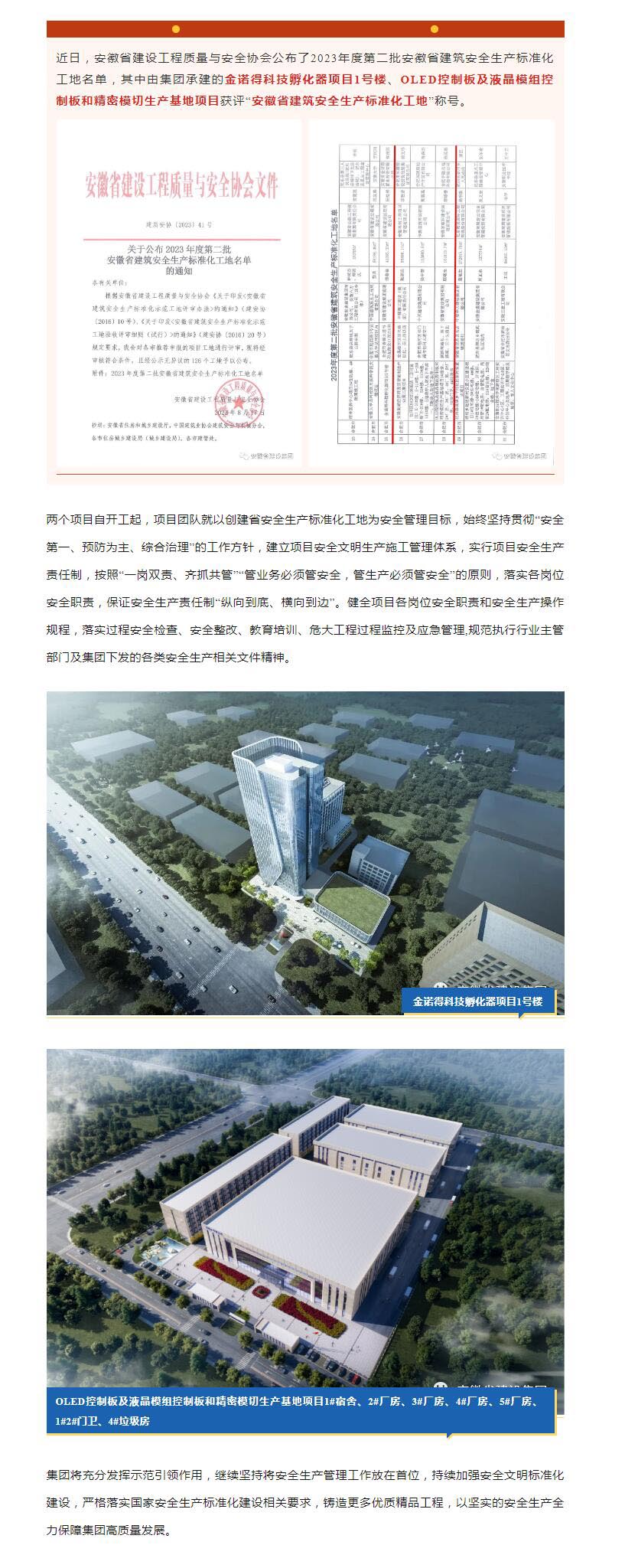 集团新增两个“安徽省建筑安全生产标准化工地”